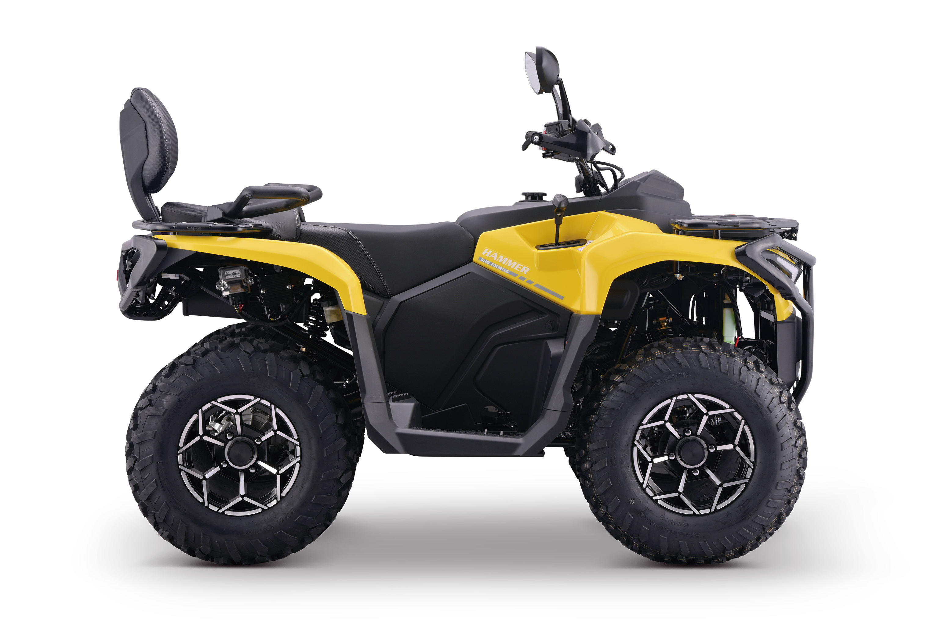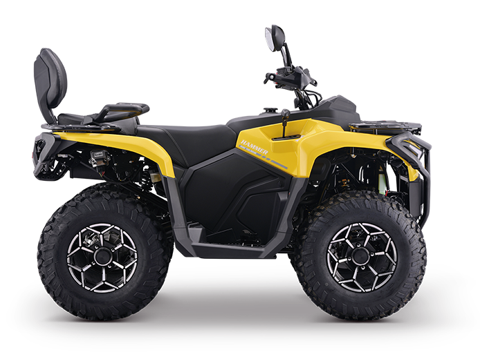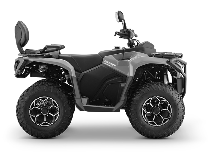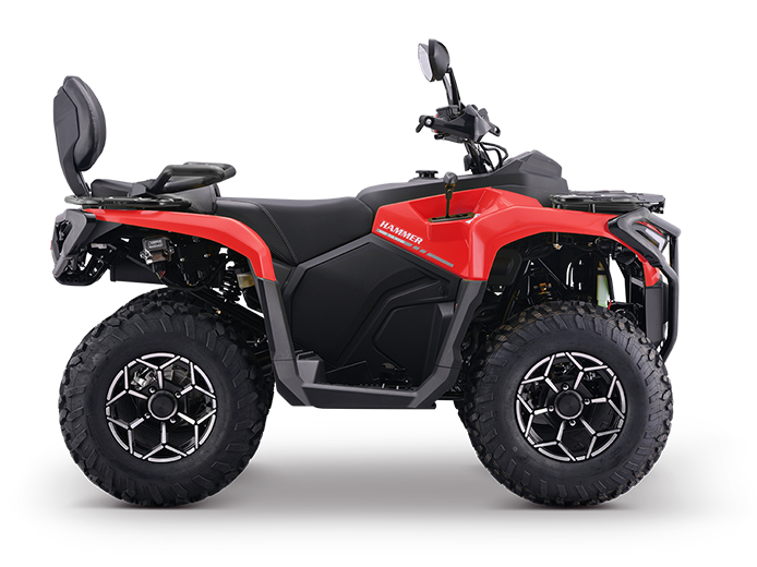 The HAMMER 300 Touring is powered by a robust 275cc liquid-cooled engine and durable shaft drive, built for heavy-duty use, mixed terrains, and long-distance touring. Its 24-inch off-road tires and reinforced suspension deliver excellent ground clearance and stability across mud, gravel, and rough trails. With hydraulic brakes, high-mounted exhaust, and a reliable instrument cluster, it combines power, durability, and comfort—ideal for agriculture, patrol work, and outdoor expeditions.